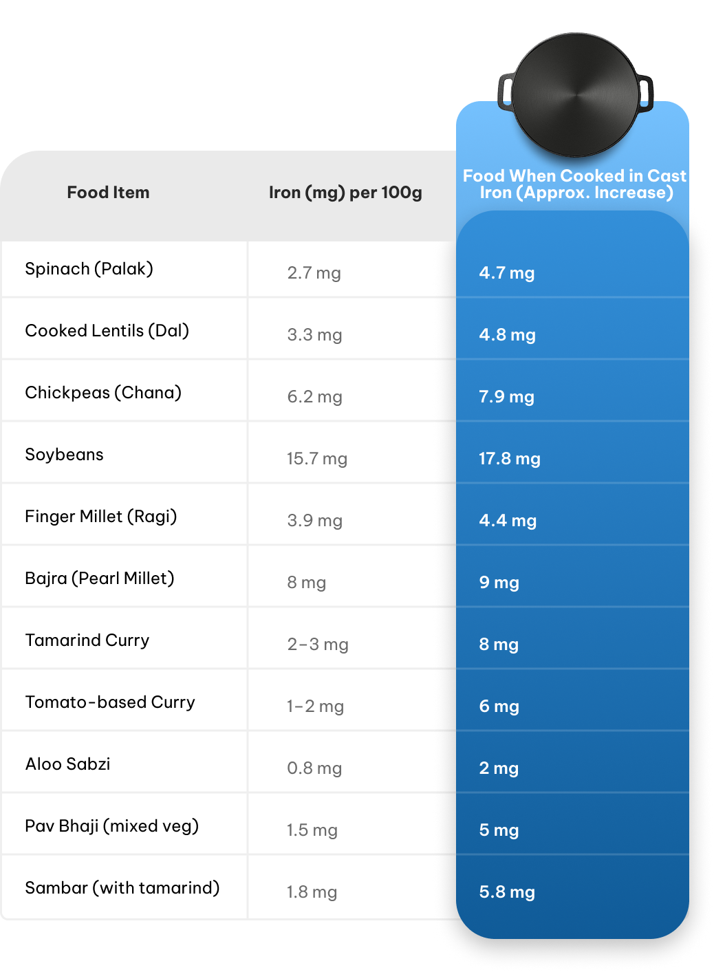 Cast iron cookware boosts iron intake by up to 3X compared to regular pans — helping fight fatigue, improve health, and support a happier, stronger life.